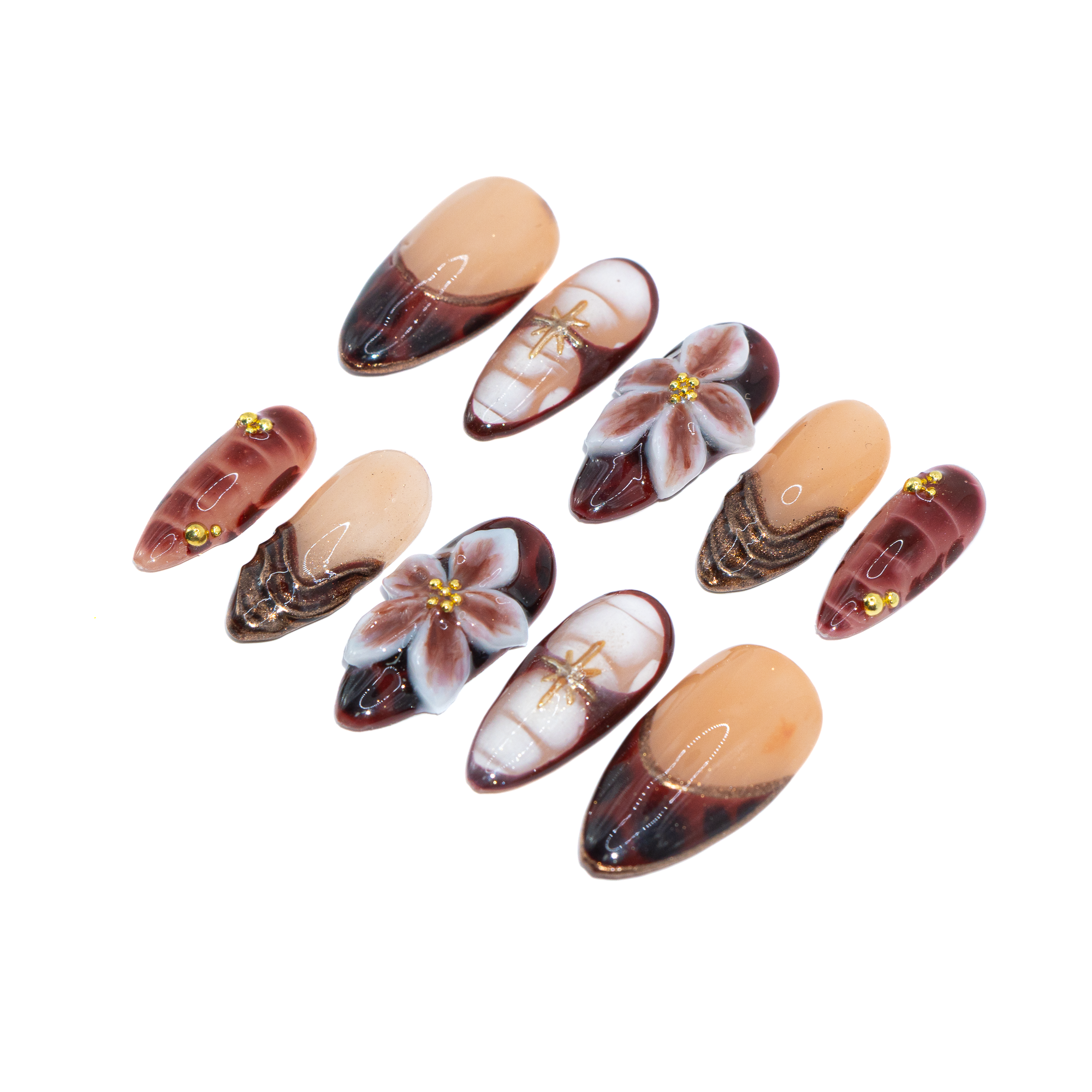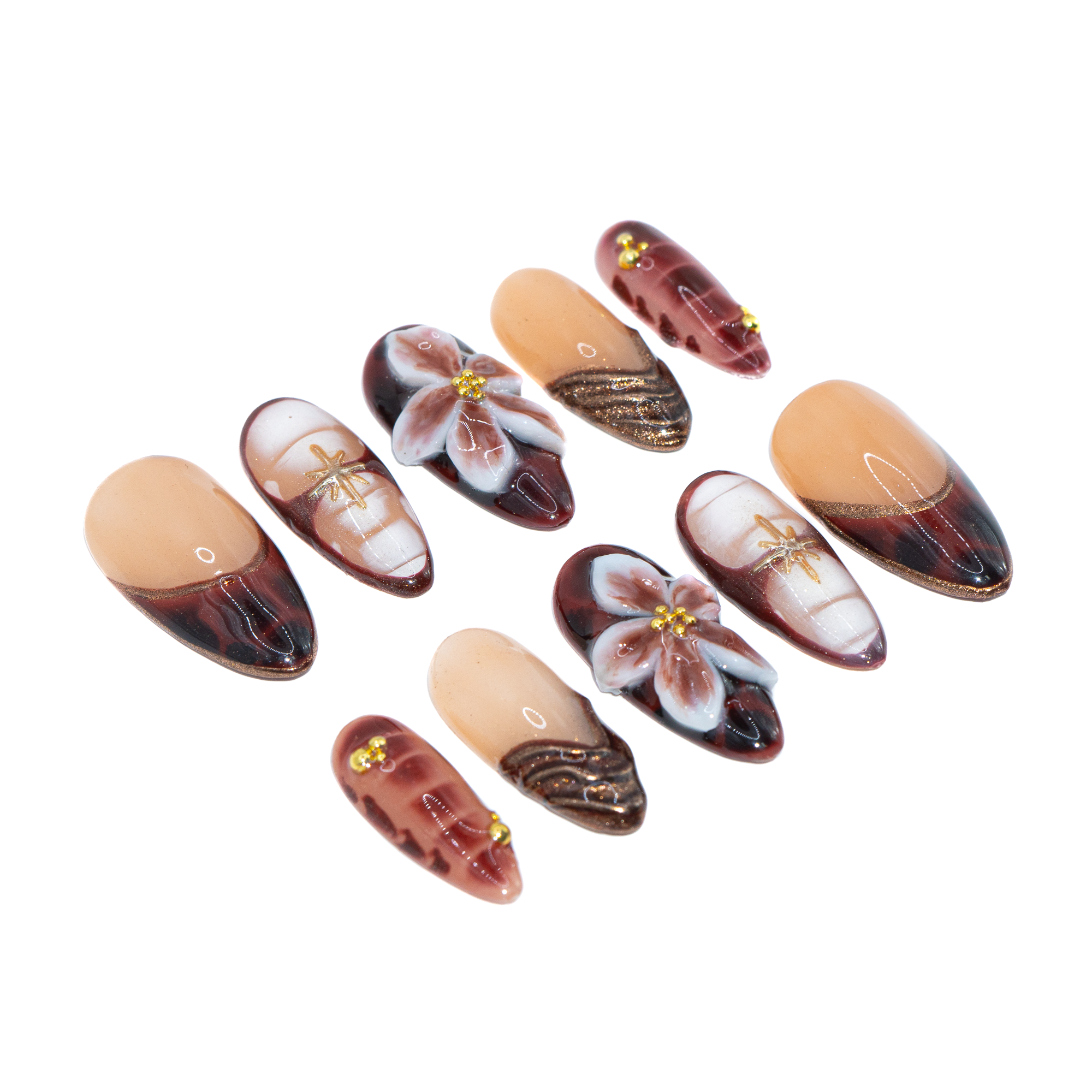 - Features hand-sculpted 3D flowers, gold embellishments, and ombre burgundy tips