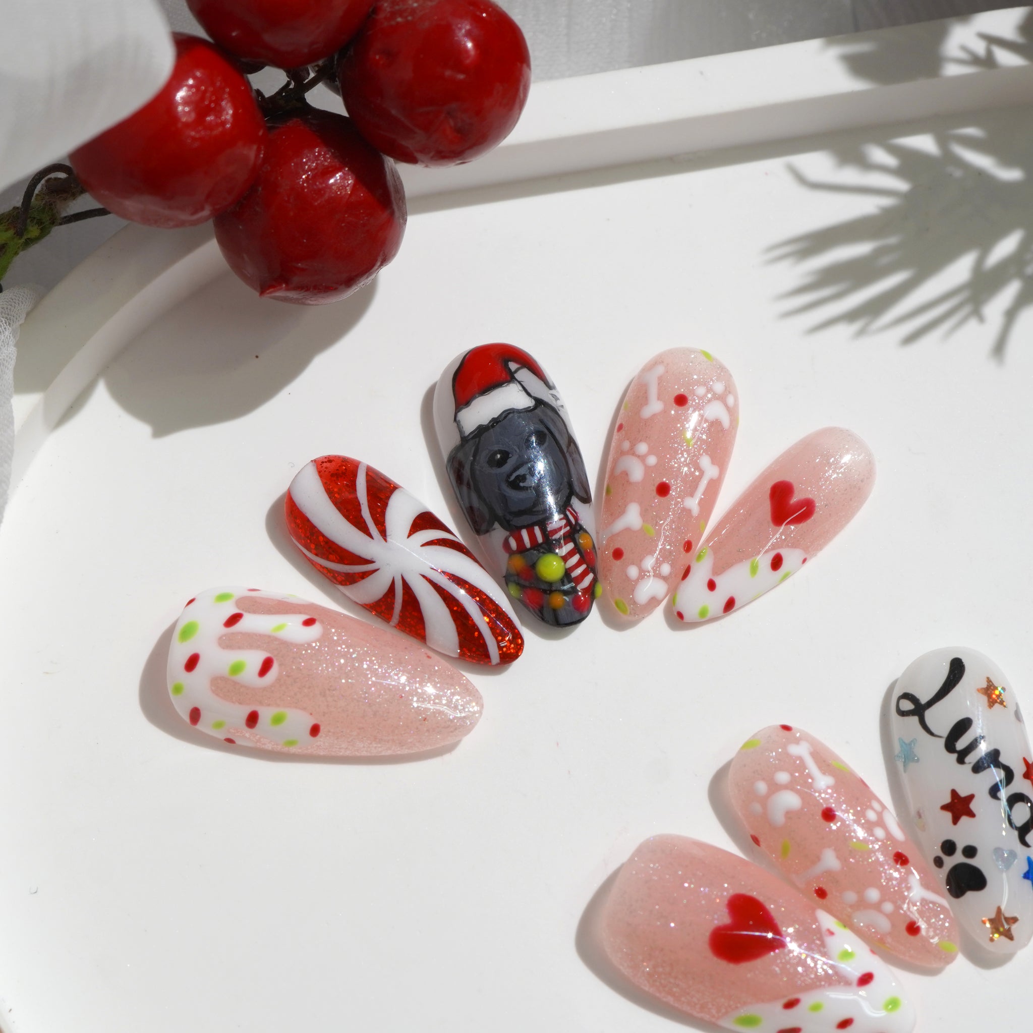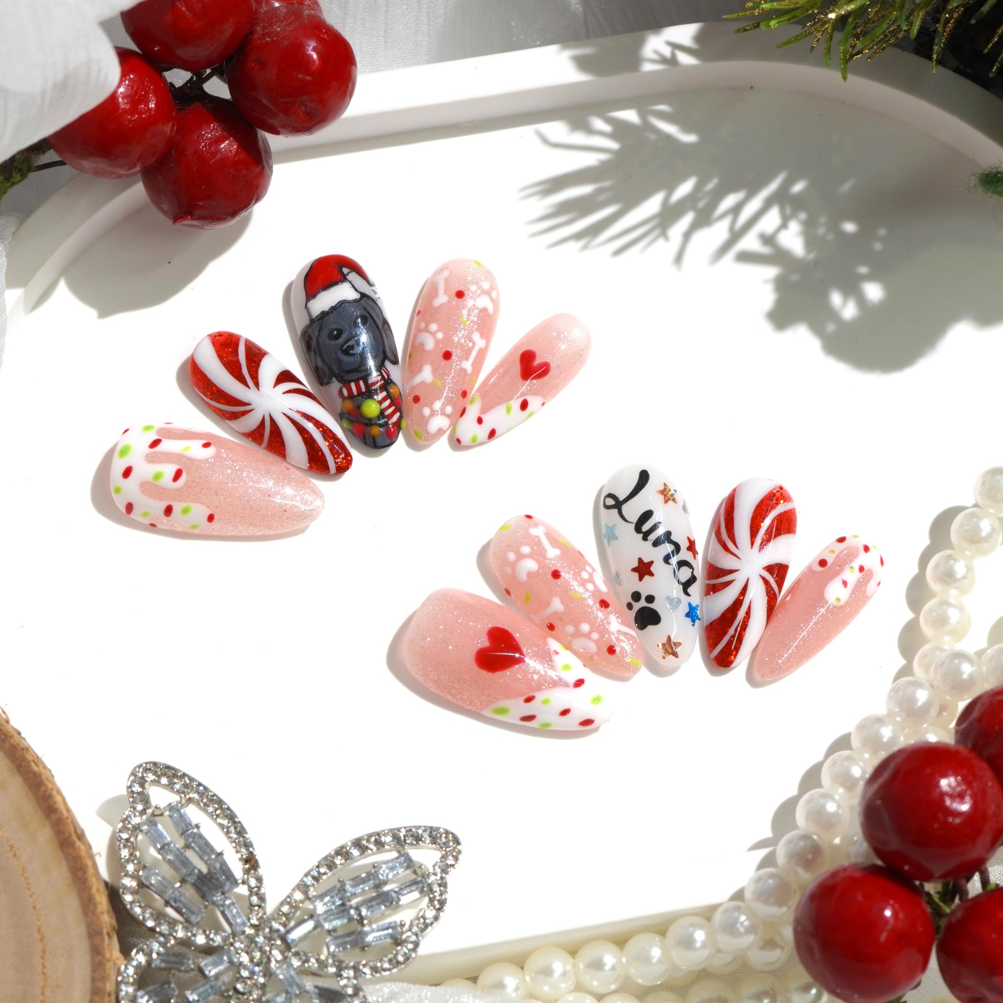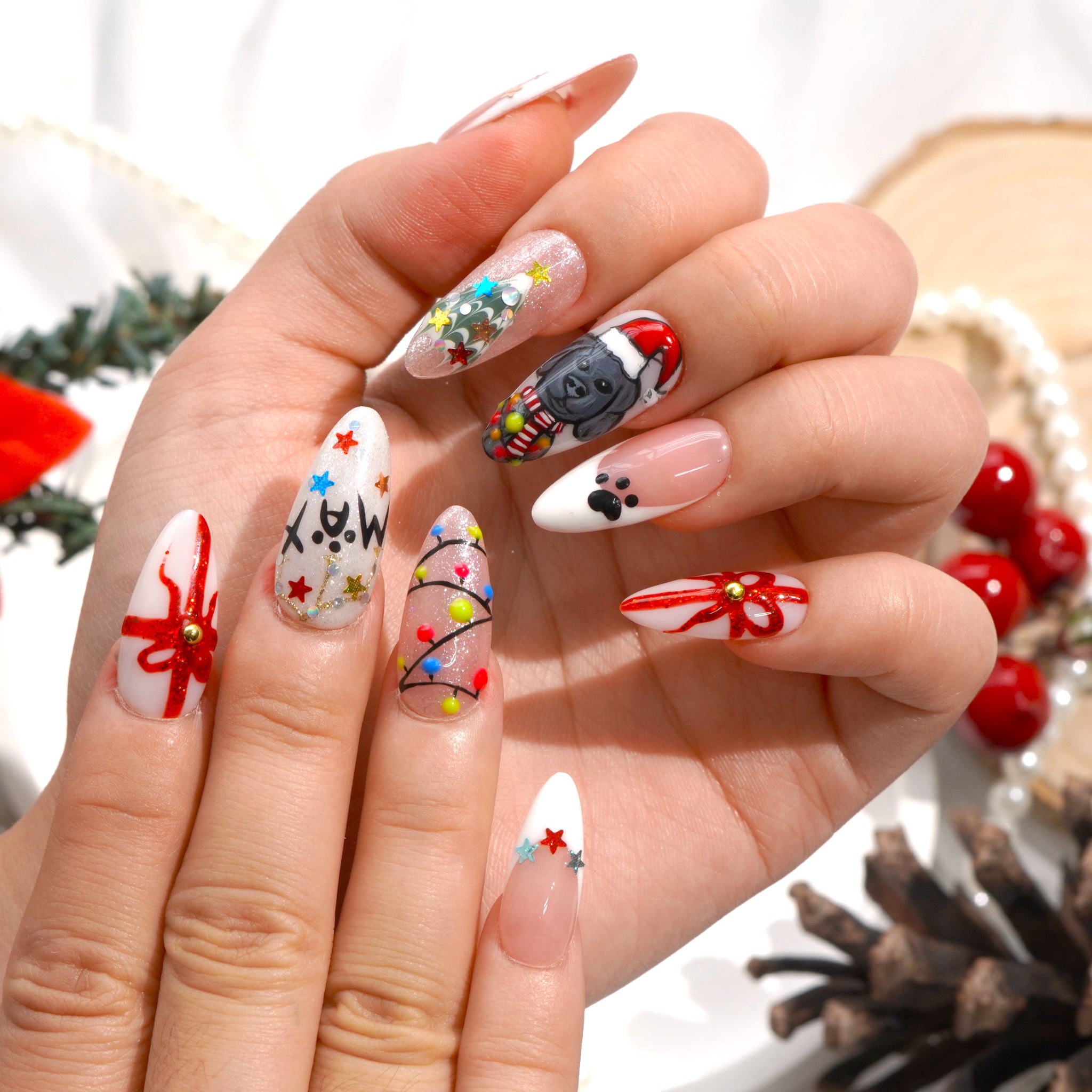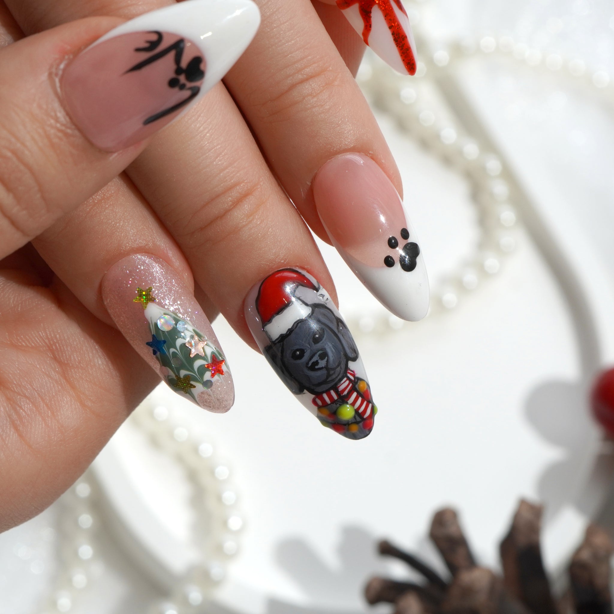 The nail set is inspired by the popular Labrado Retriever breed, combined with familiar Christmas symbols such as Santa hats, snowflakes, Christmas trees, and red bows.