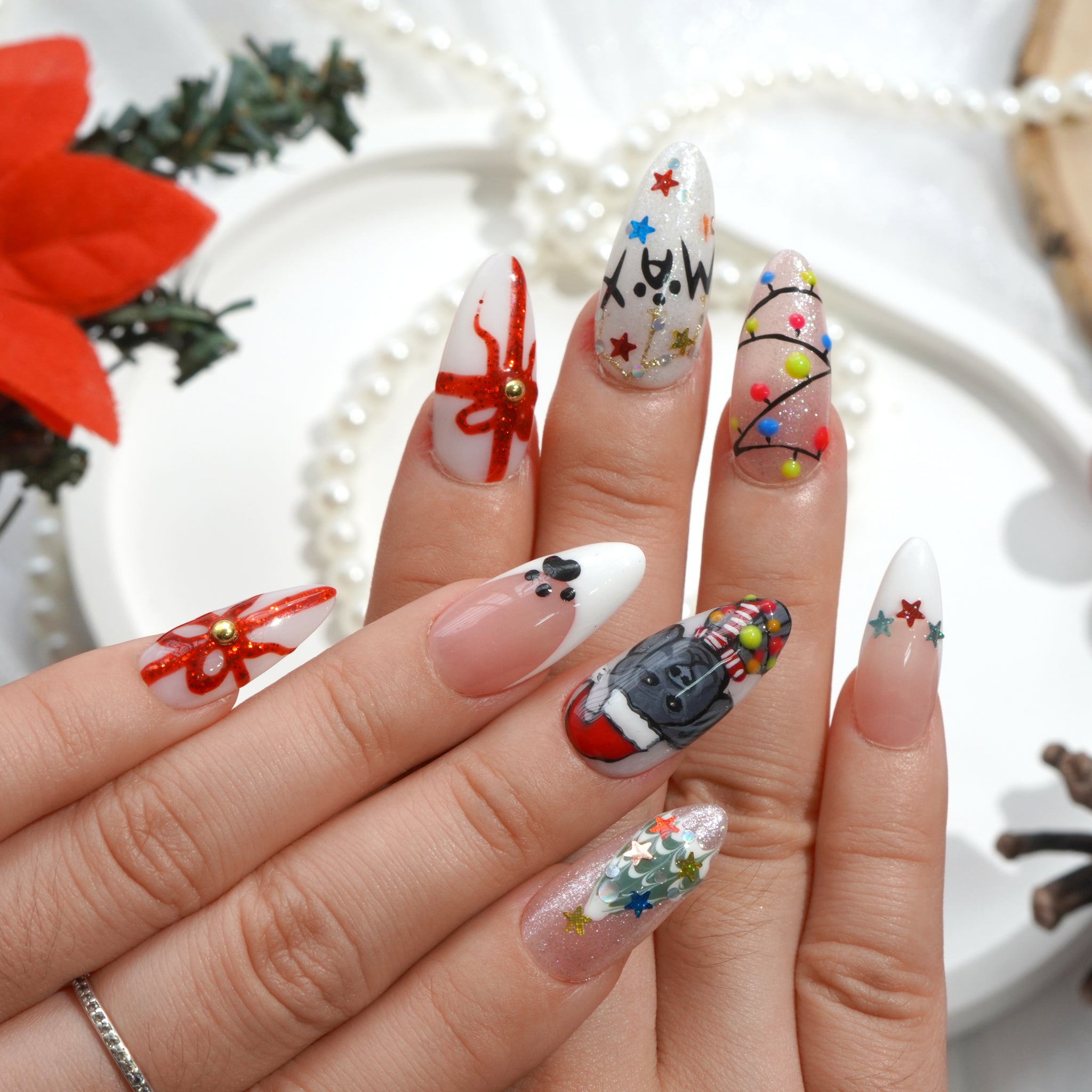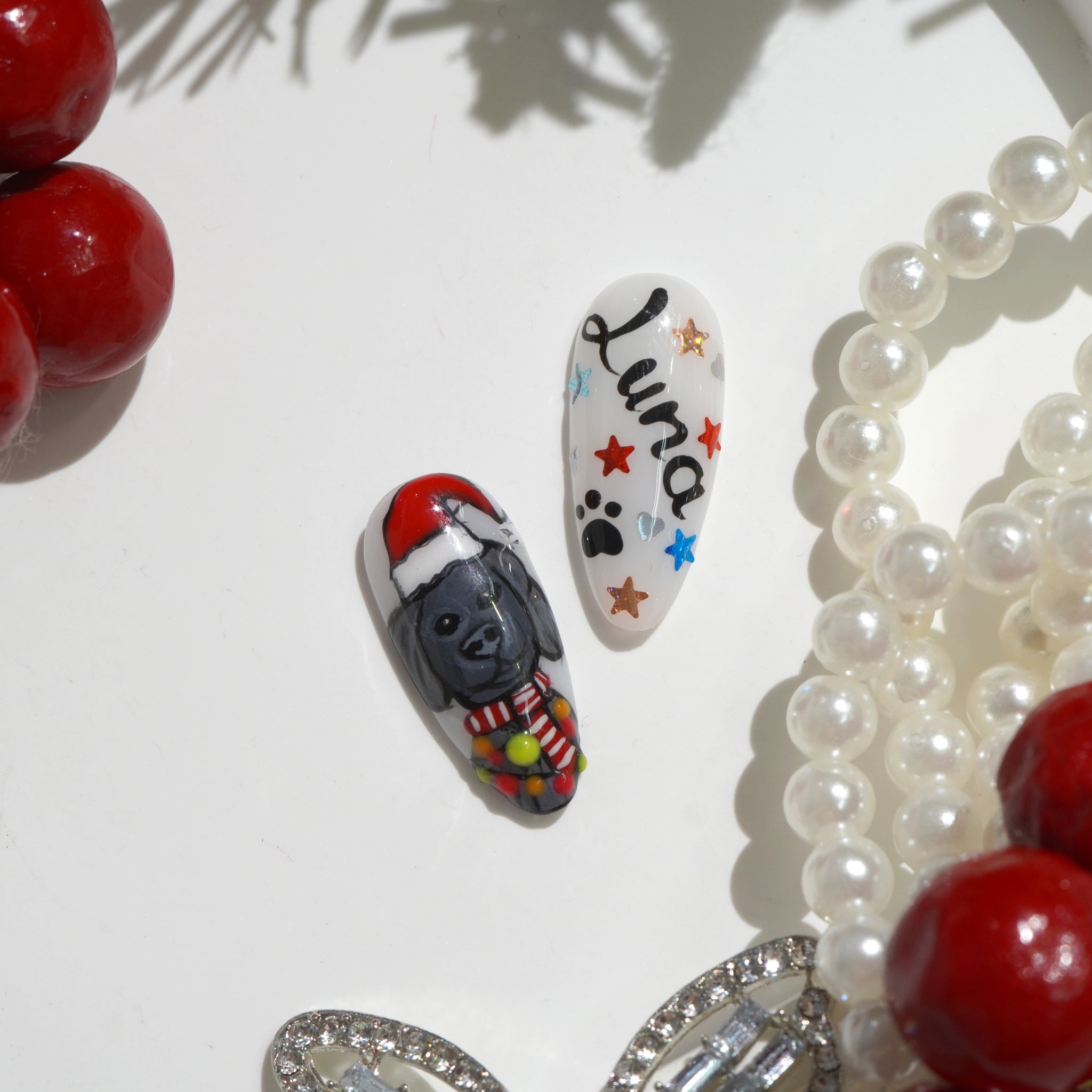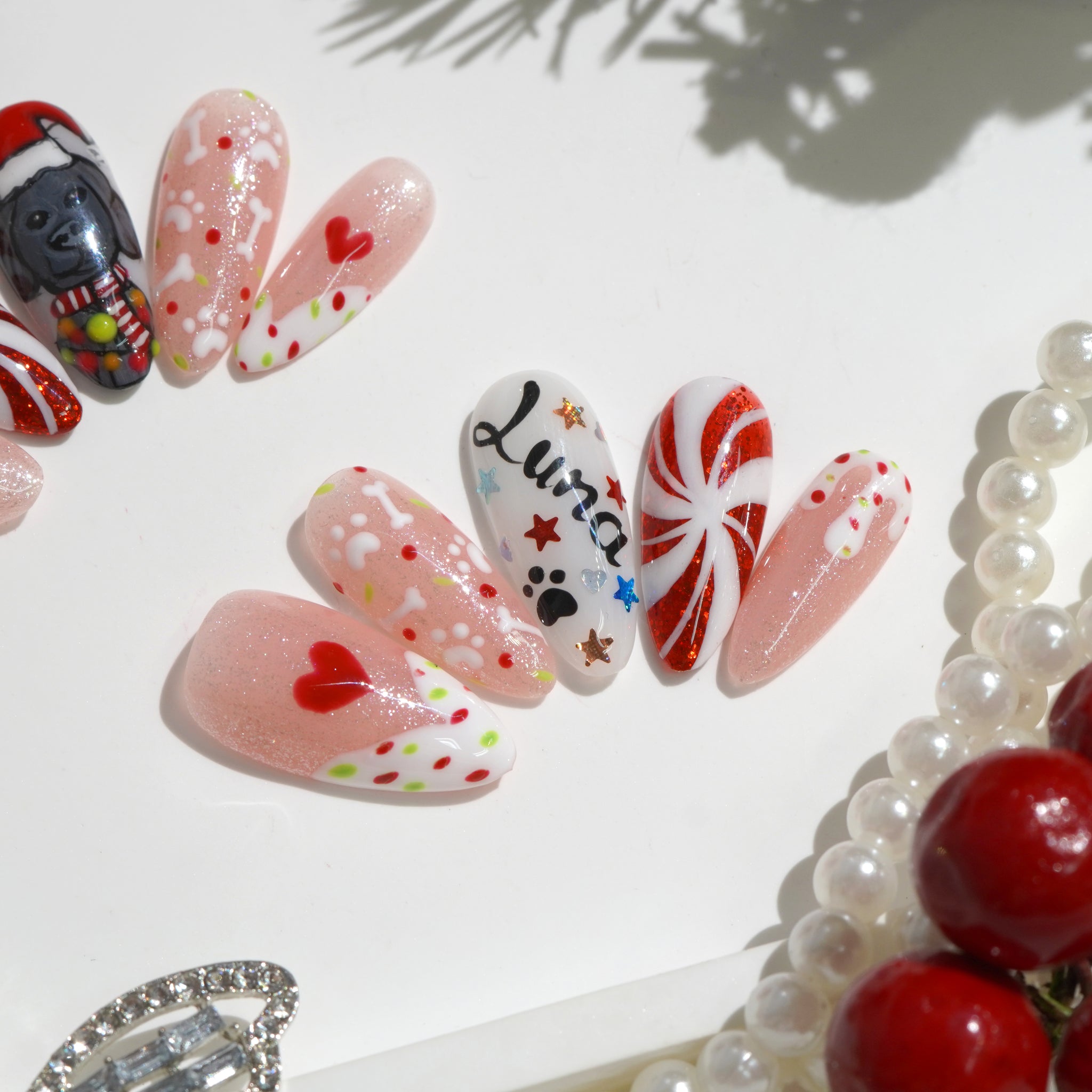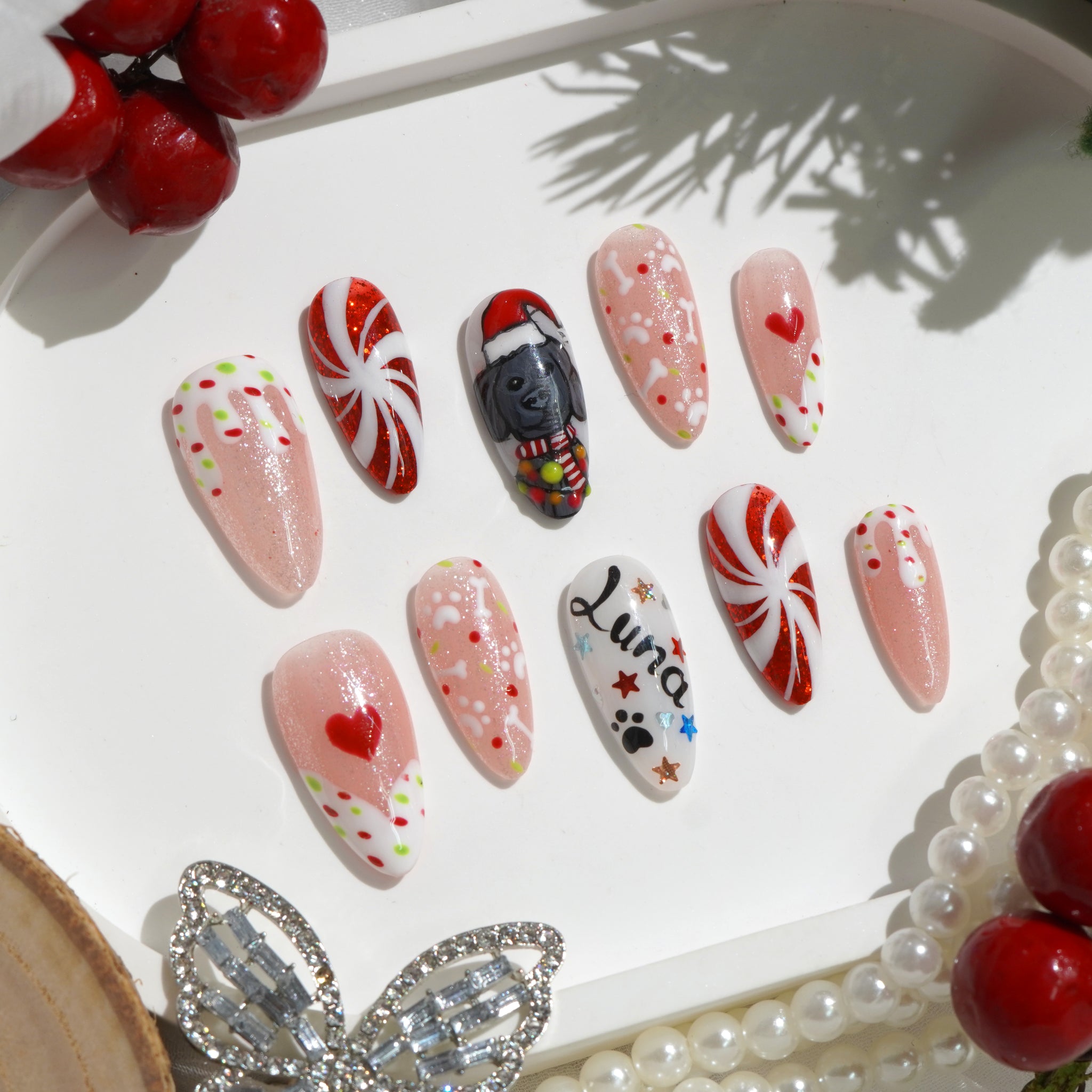 The nail set is inspired by the popular Labrado Retriever breed, combined with familiar Christmas symbols such as Santa hats, snowflakes, Christmas trees, and red bows.
