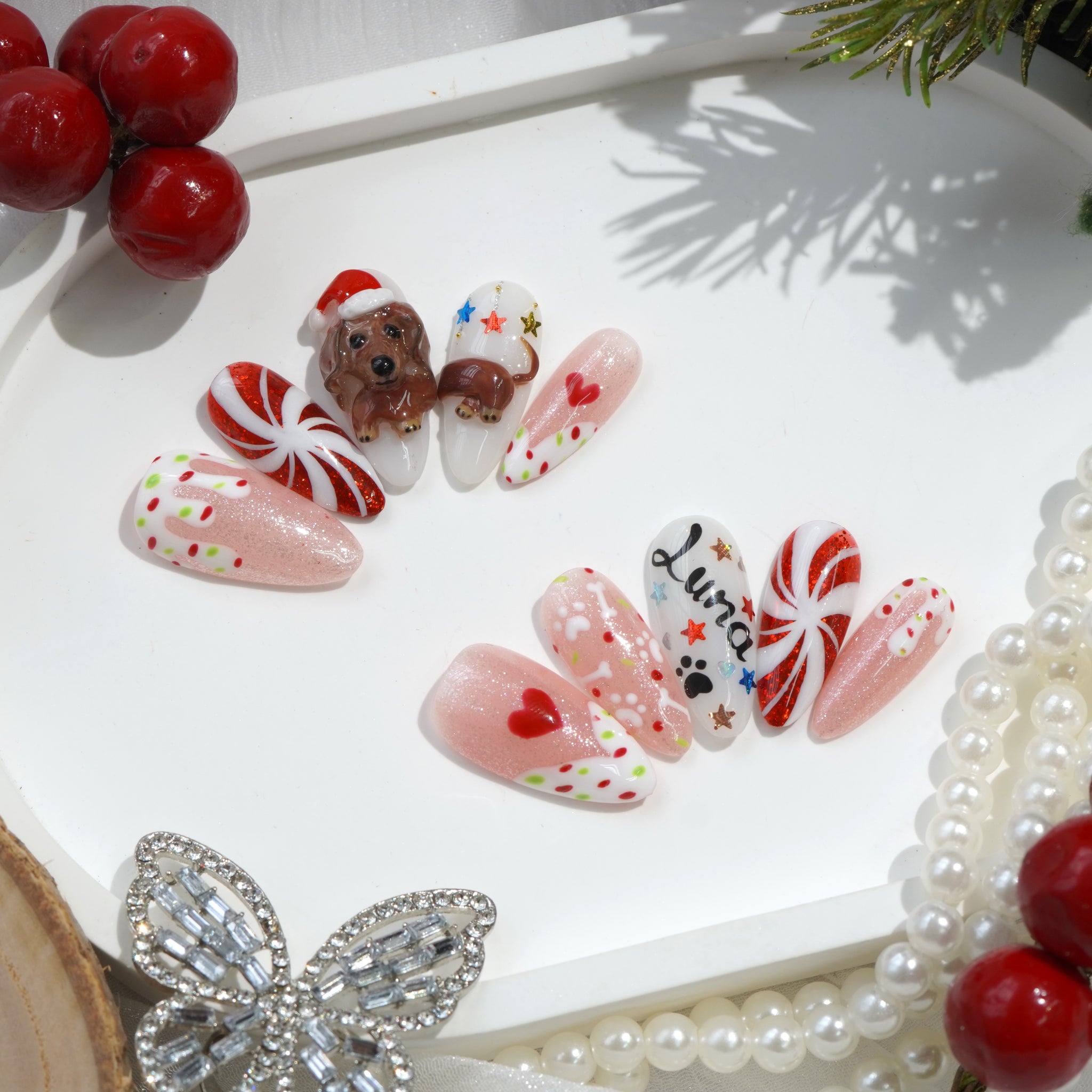 The nail set is inspired by the popular Dachshund breed, combined with familiar Christmas symbols such as Santa hats, snowflakes, Christmas trees, and red bows.