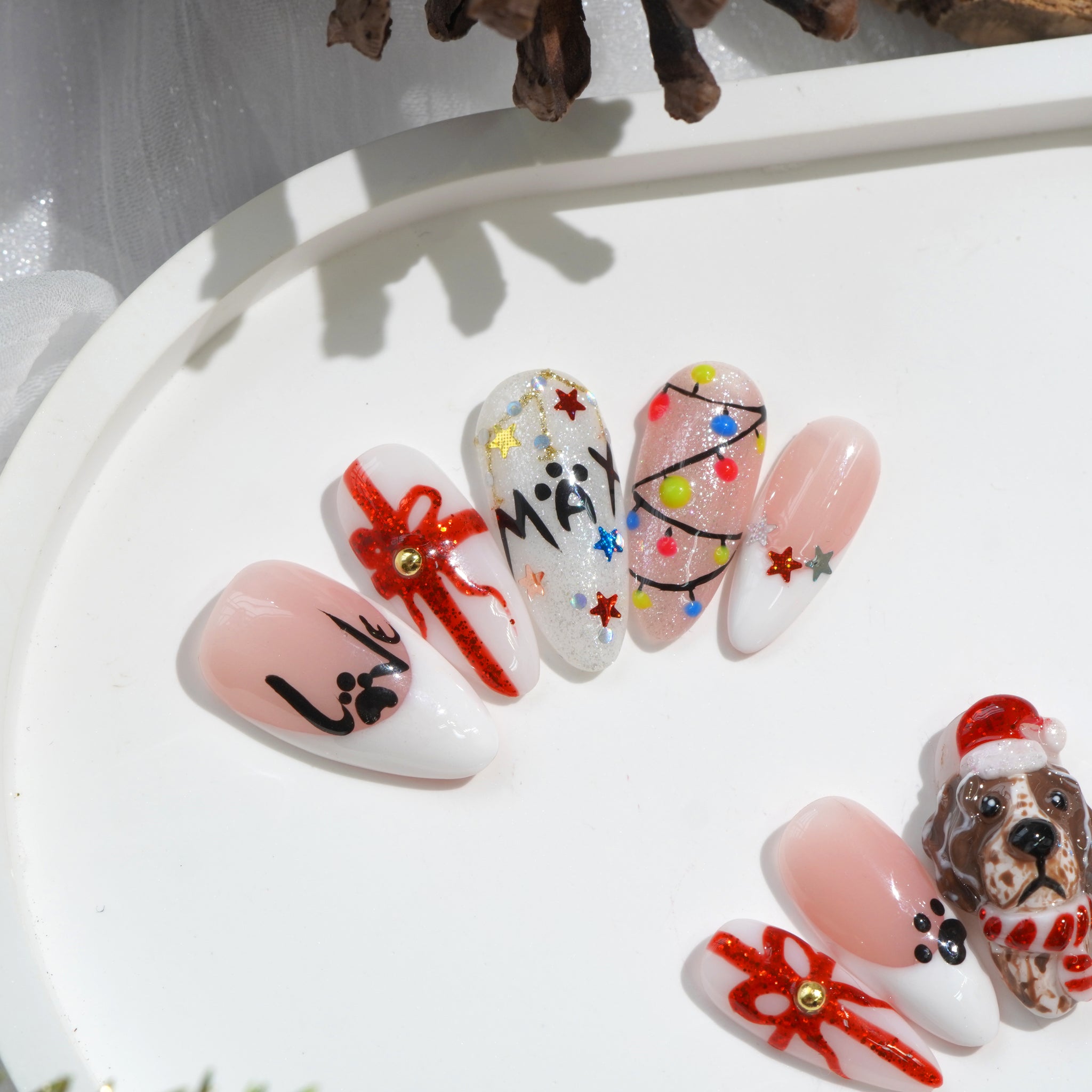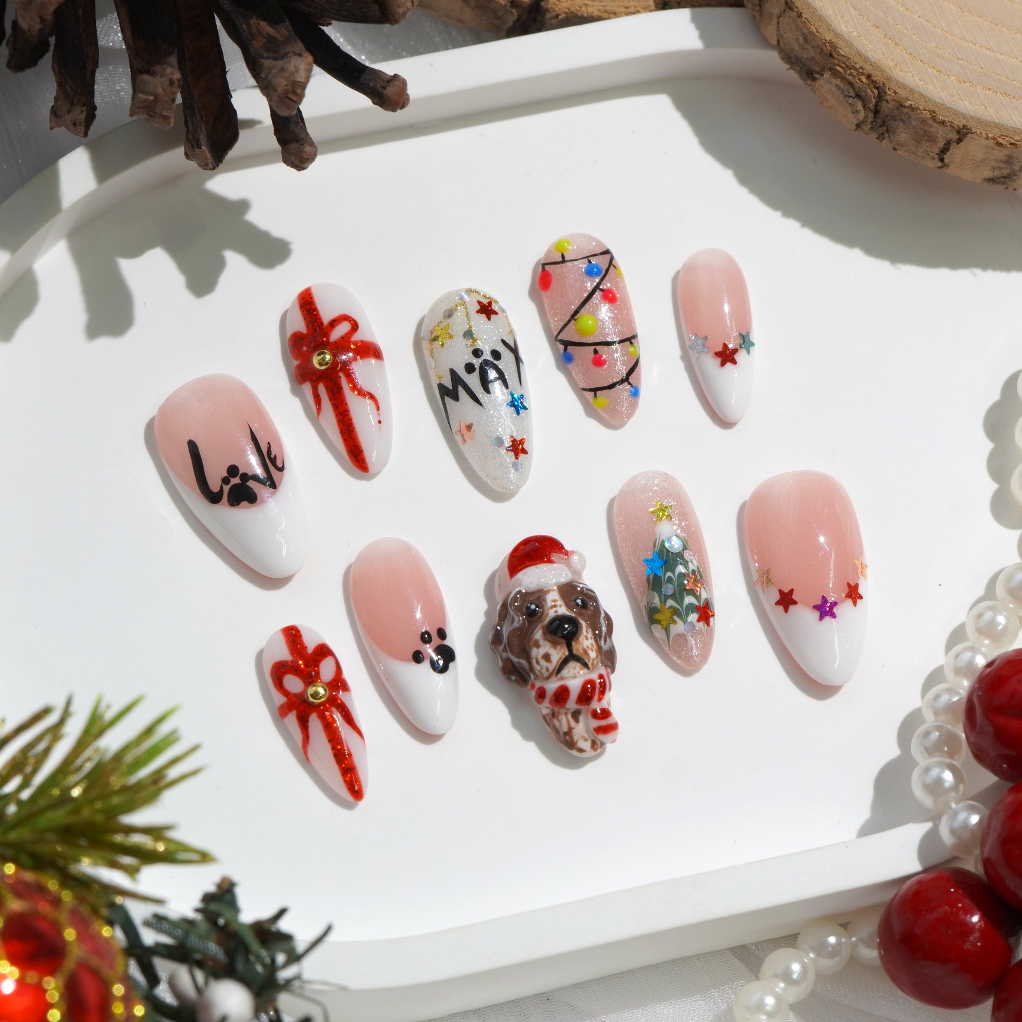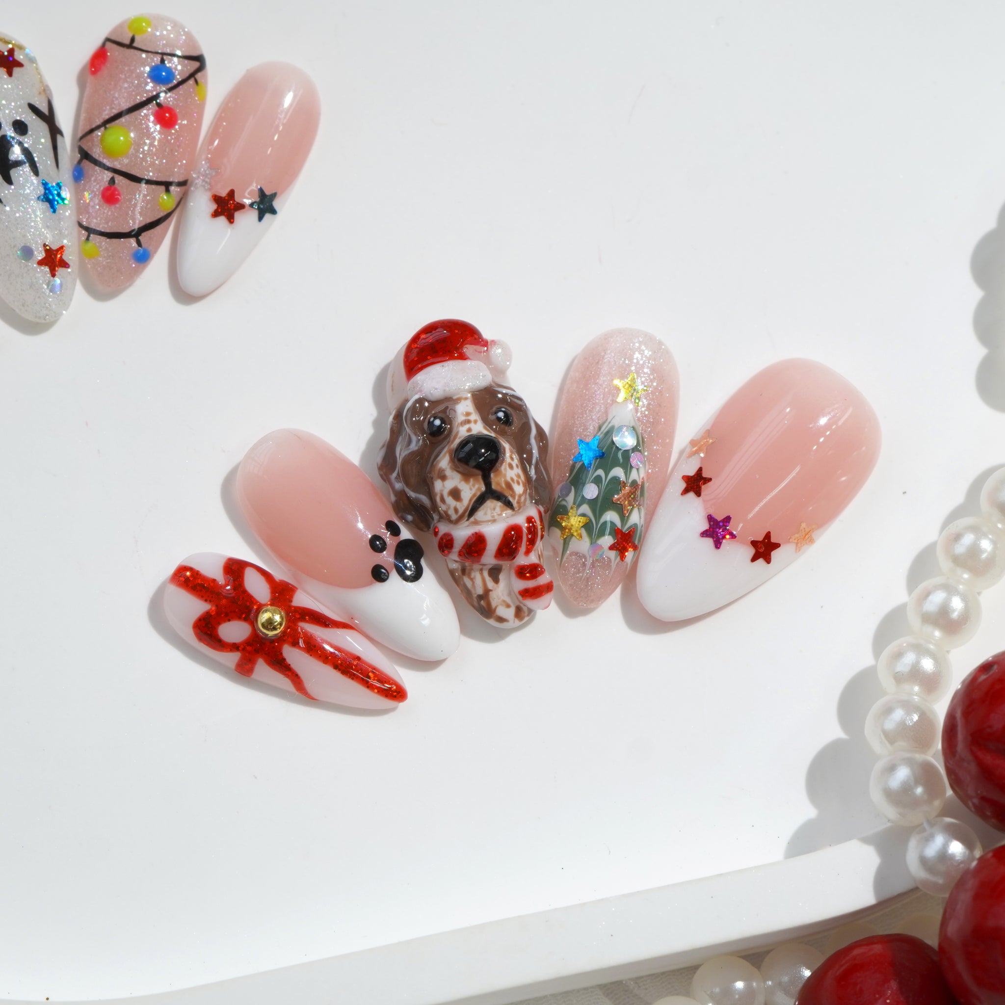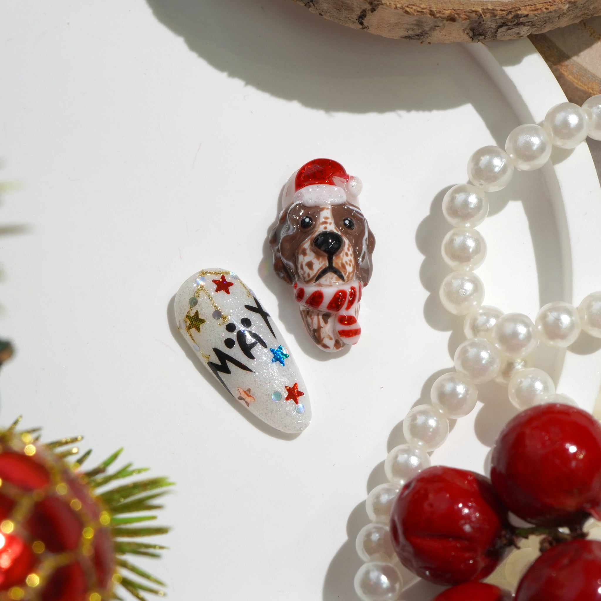 The nail set is inspired by the popular German Shorthaired Pointer breed, combined with familiar Christmas symbols such as Santa hats, snowflakes, Christmas trees, and red bows.