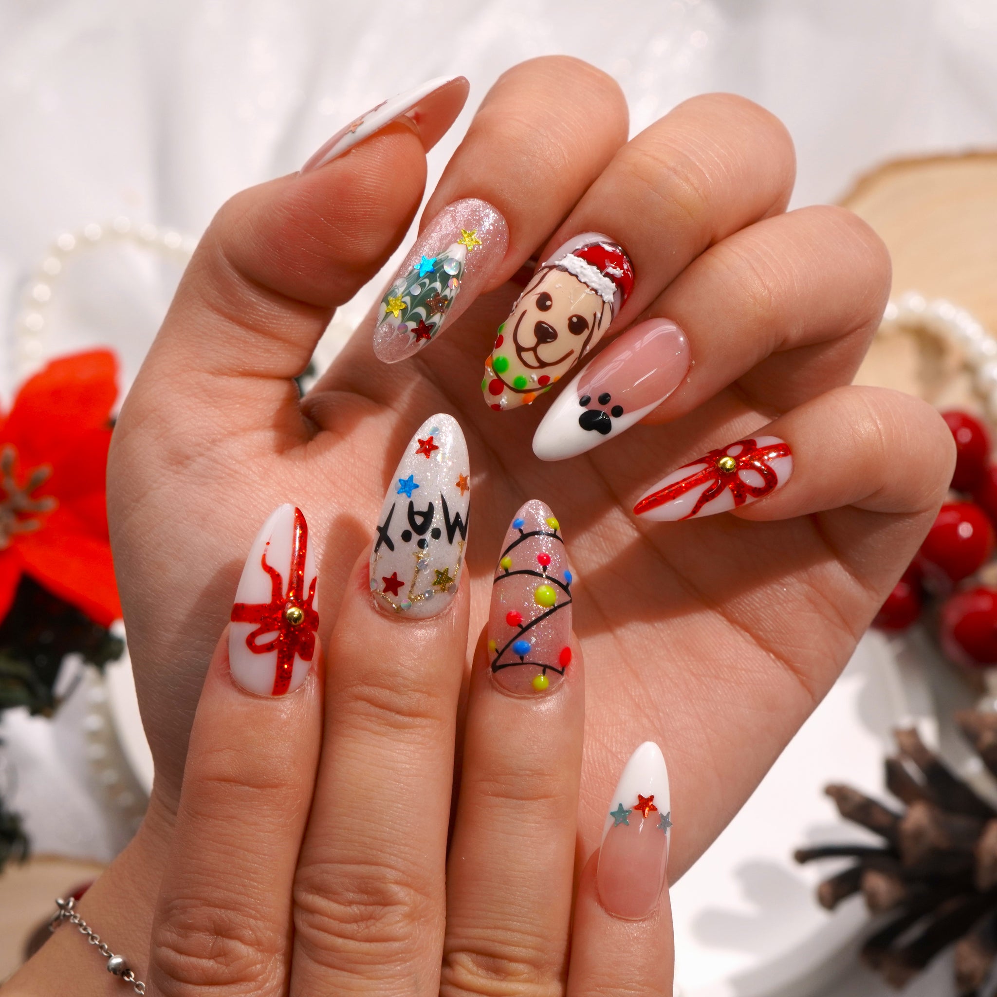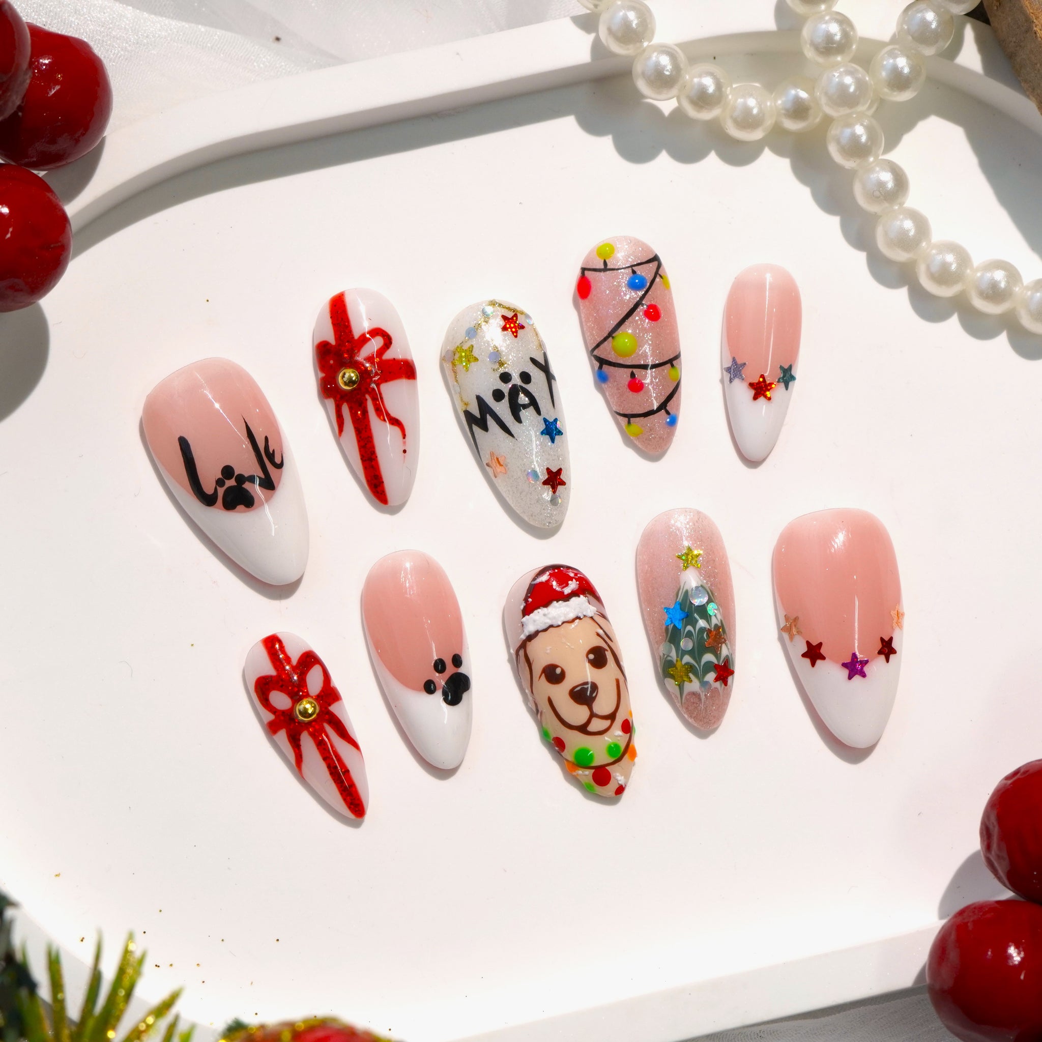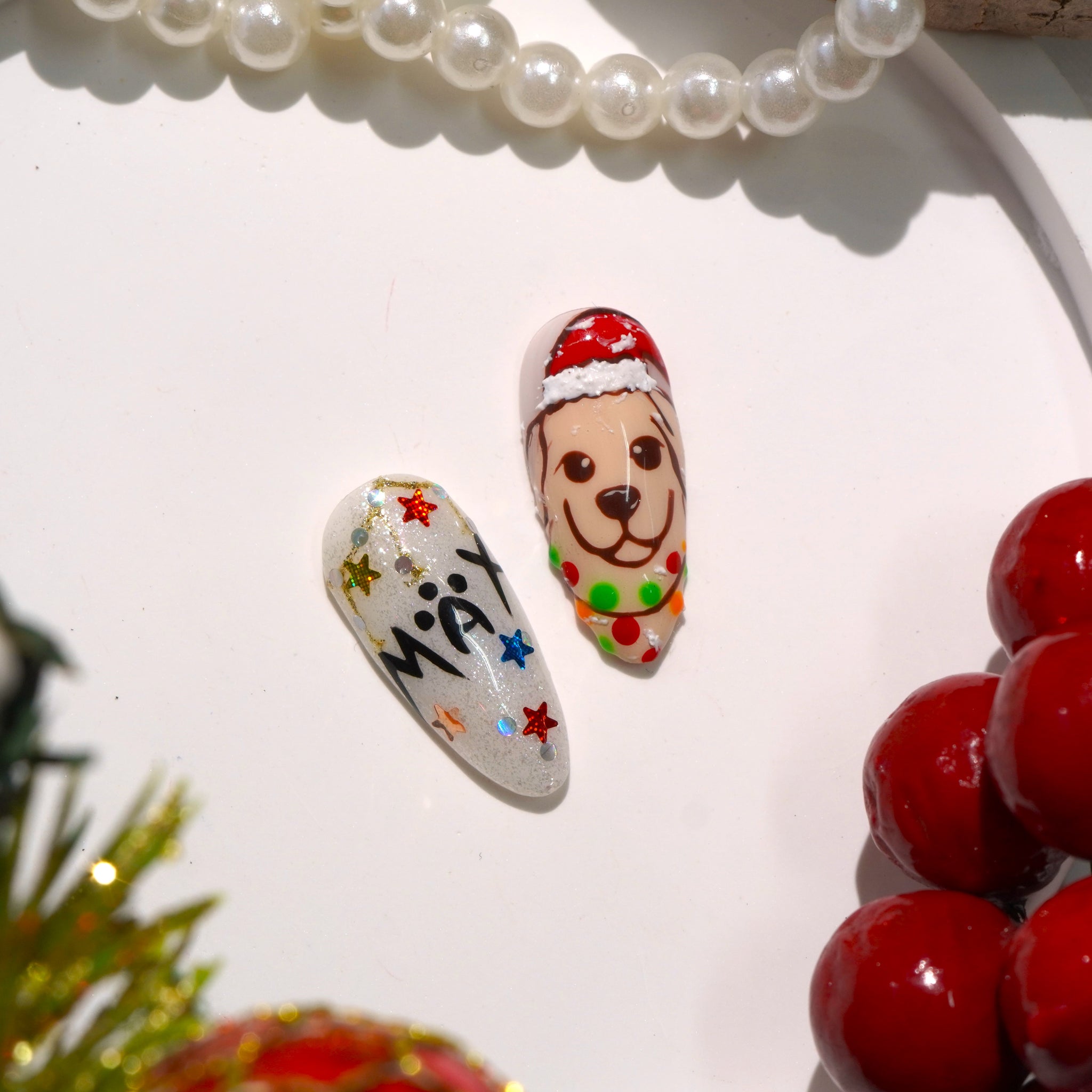 The nail set is inspired by the popular Golden Retriever breed, combined with familiar Christmas symbols such as Santa hats, snowflakes, Christmas trees, and red bows.