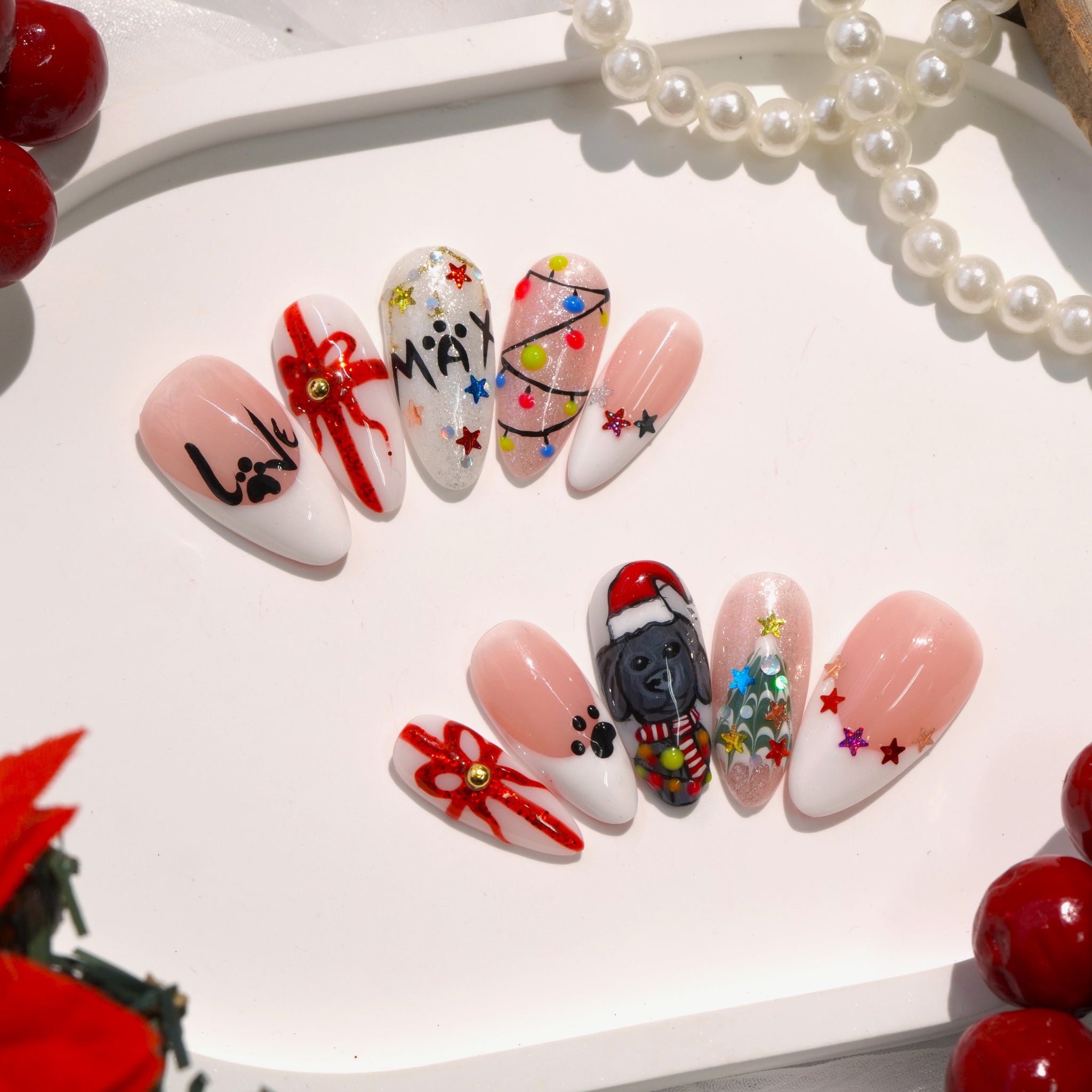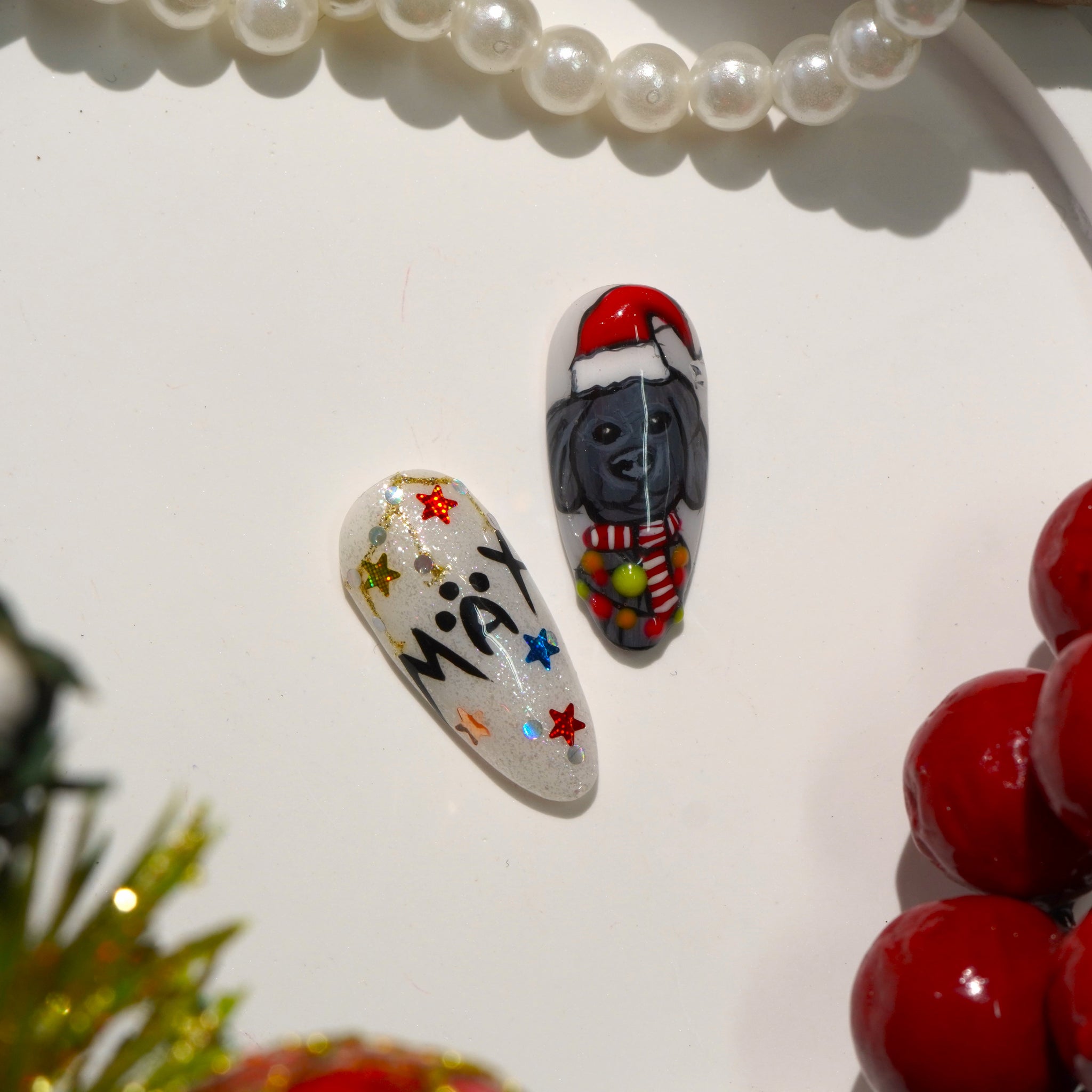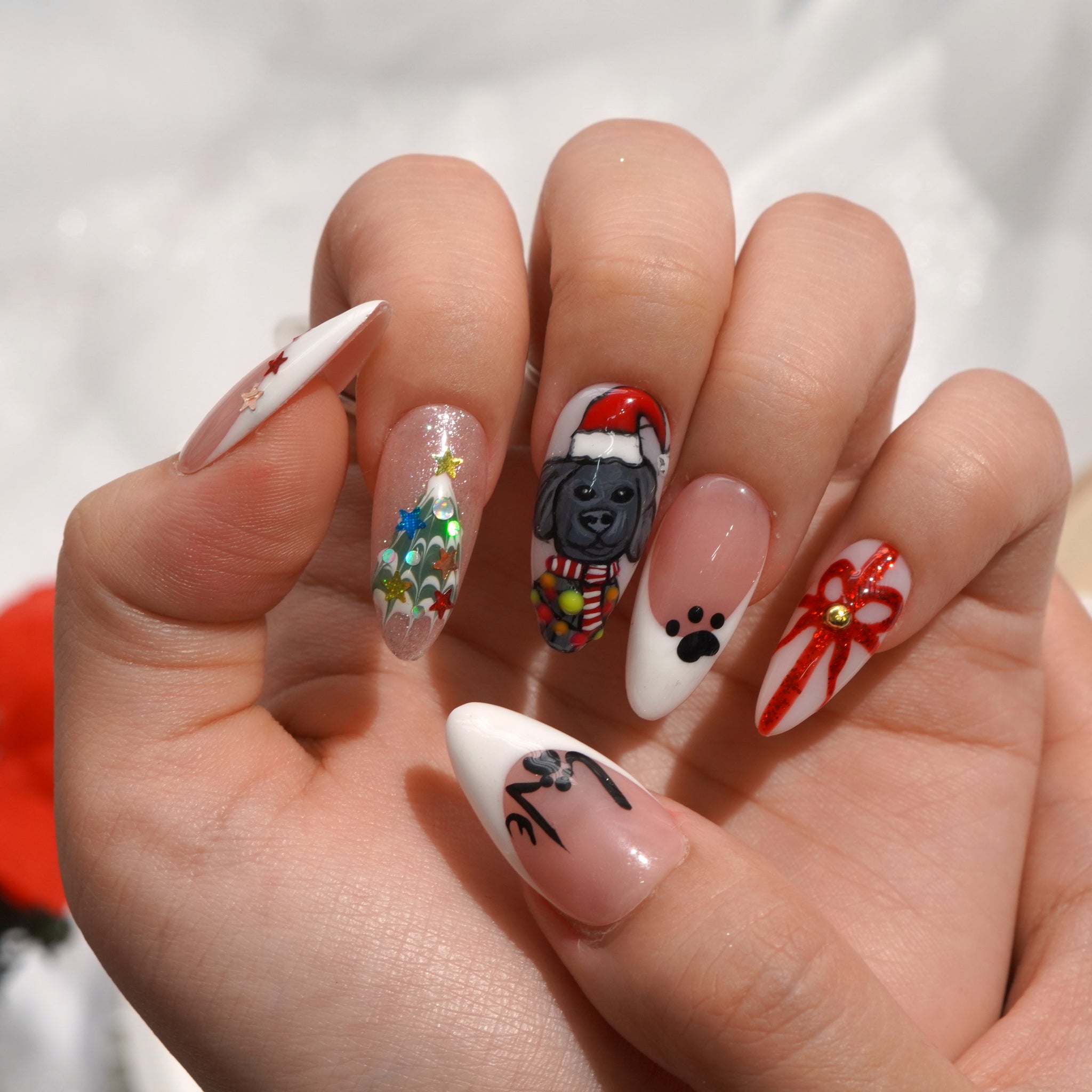 The nail set is inspired by the popular Labrado Retriever breed, combined with familiar Christmas symbols such as Santa hats, snowflakes, Christmas trees, and red bows.