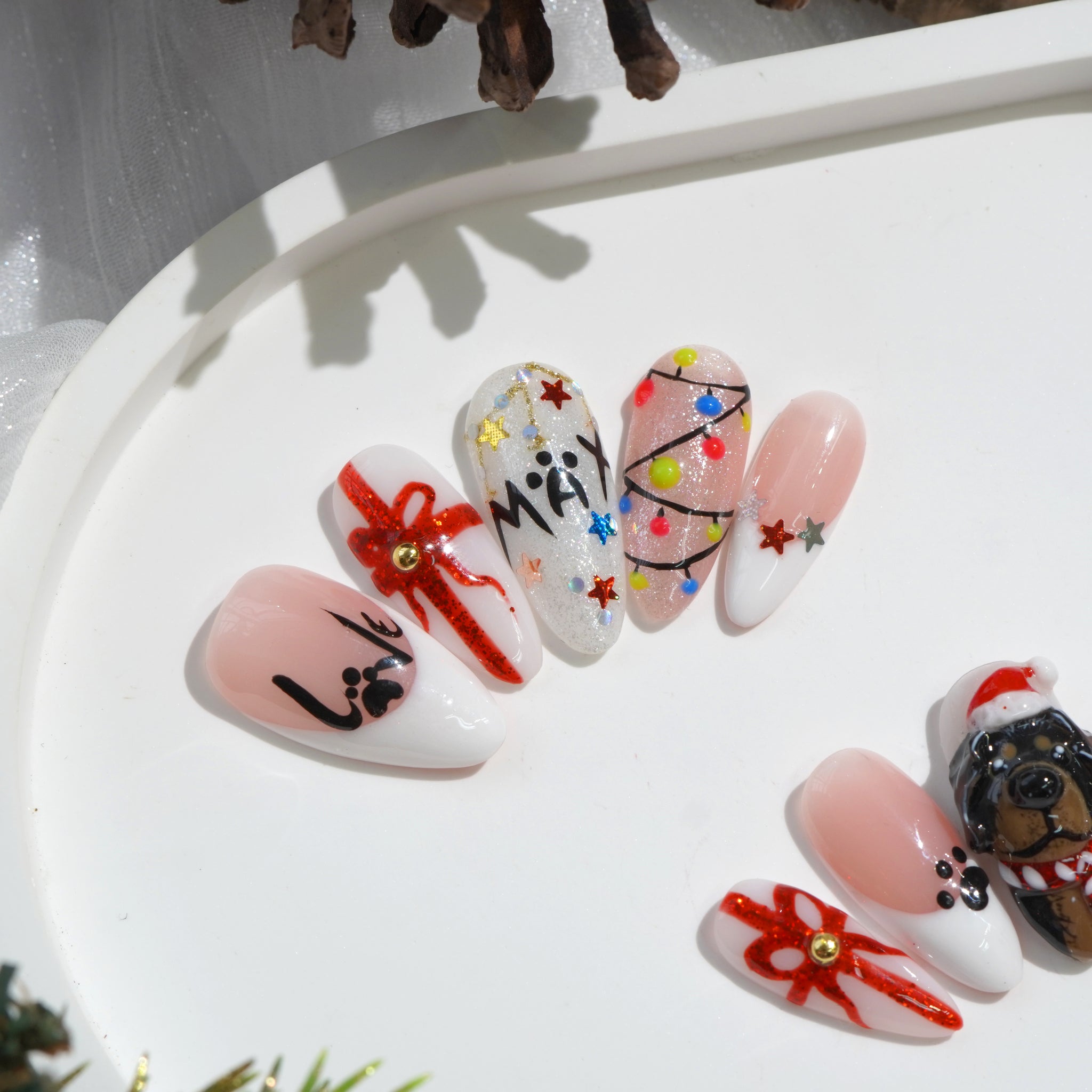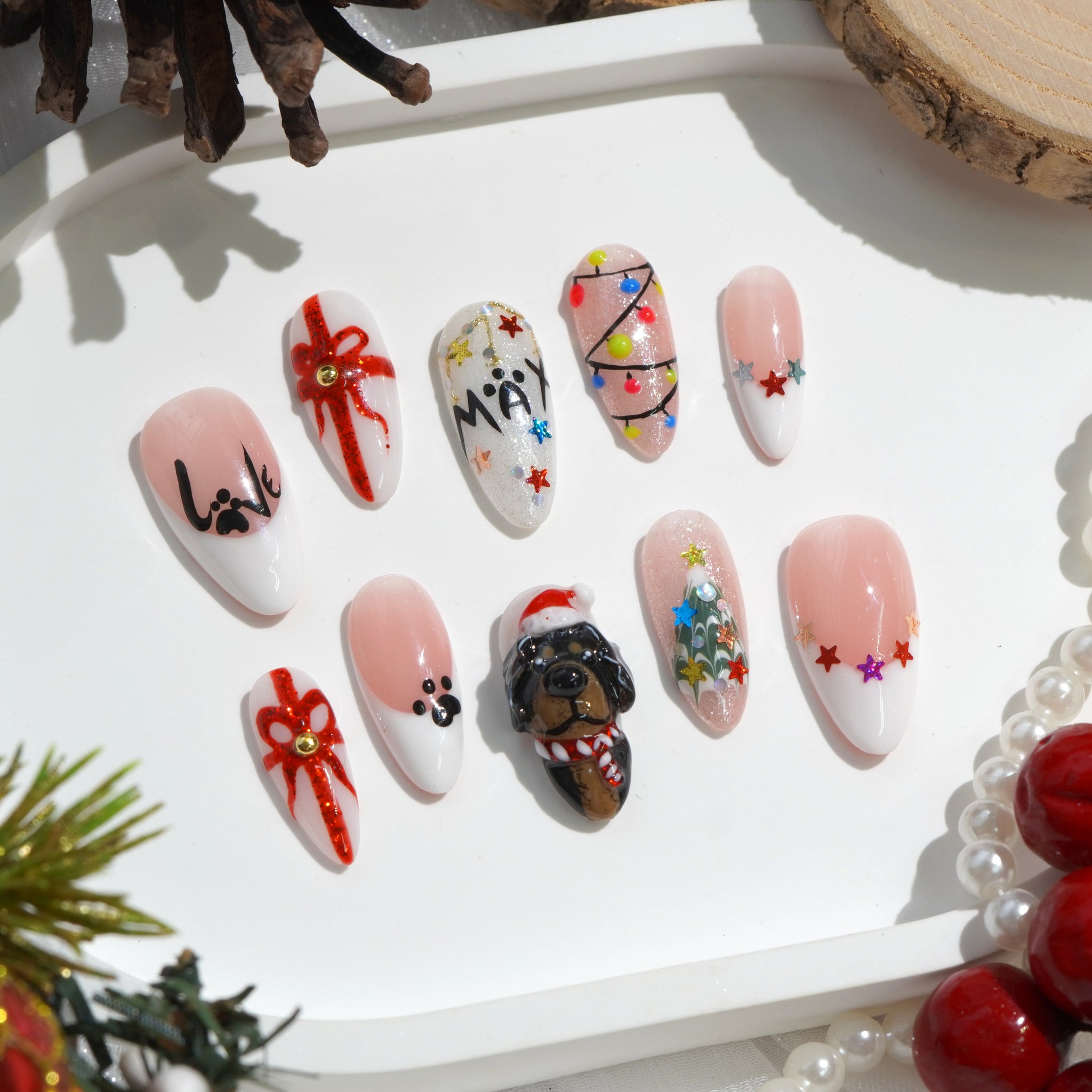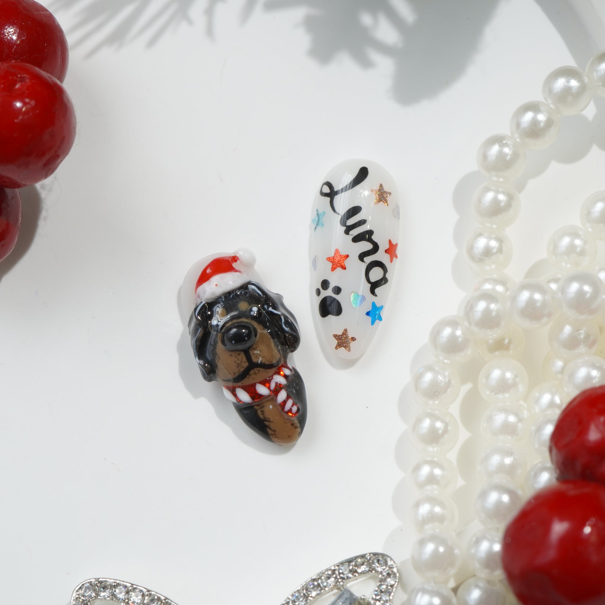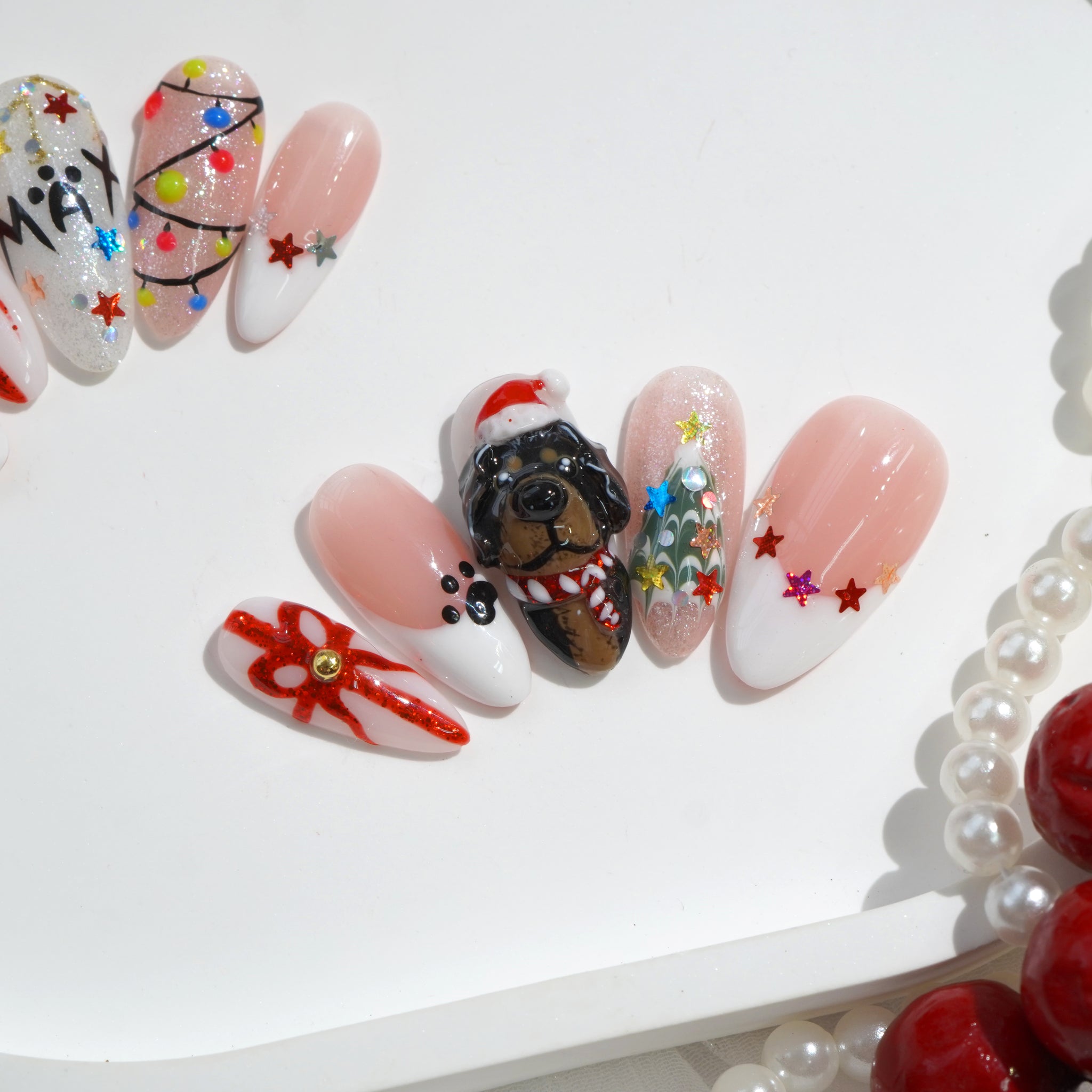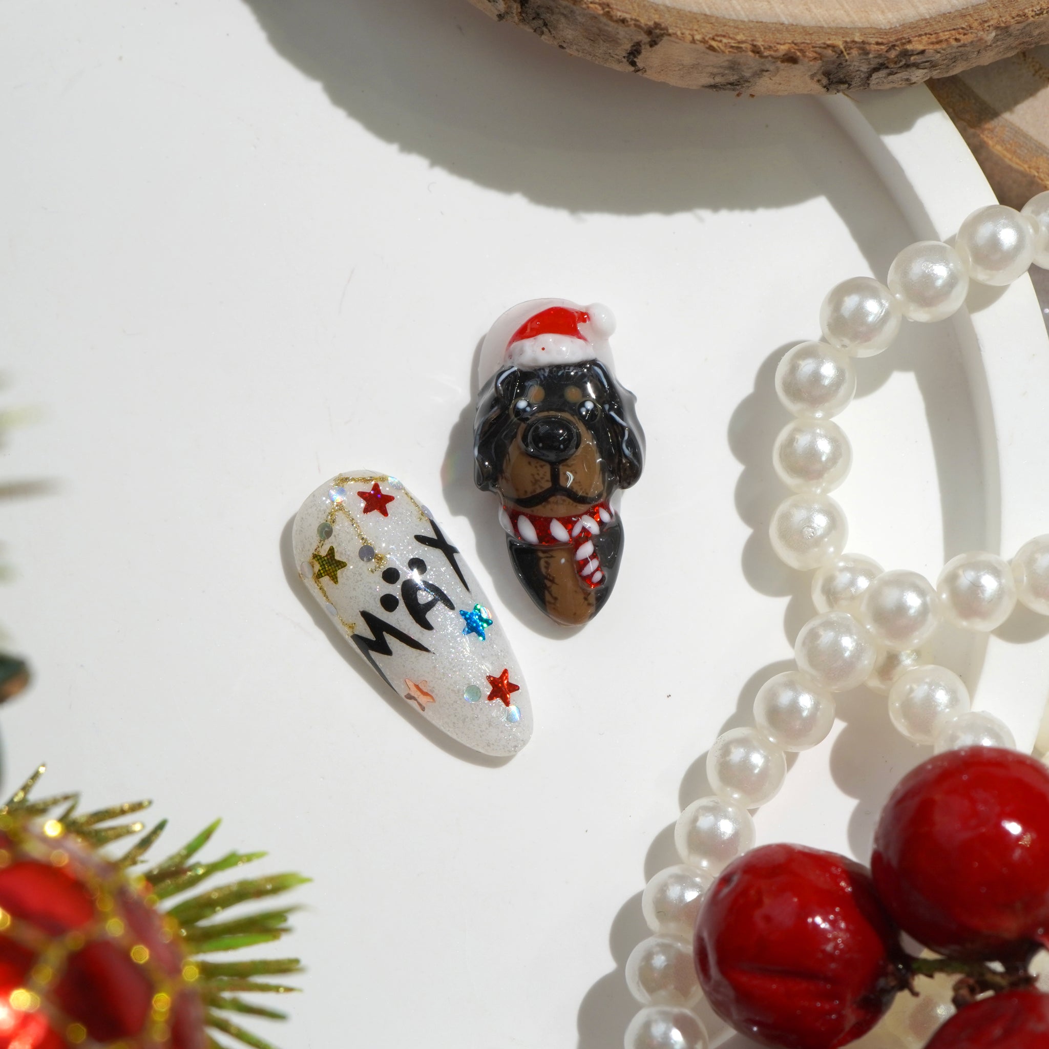 The nail set is inspired by the popular Rottweiler breed, combined with familiar Christmas symbols such as Santa hats, snowflakes, Christmas trees, and red bows.