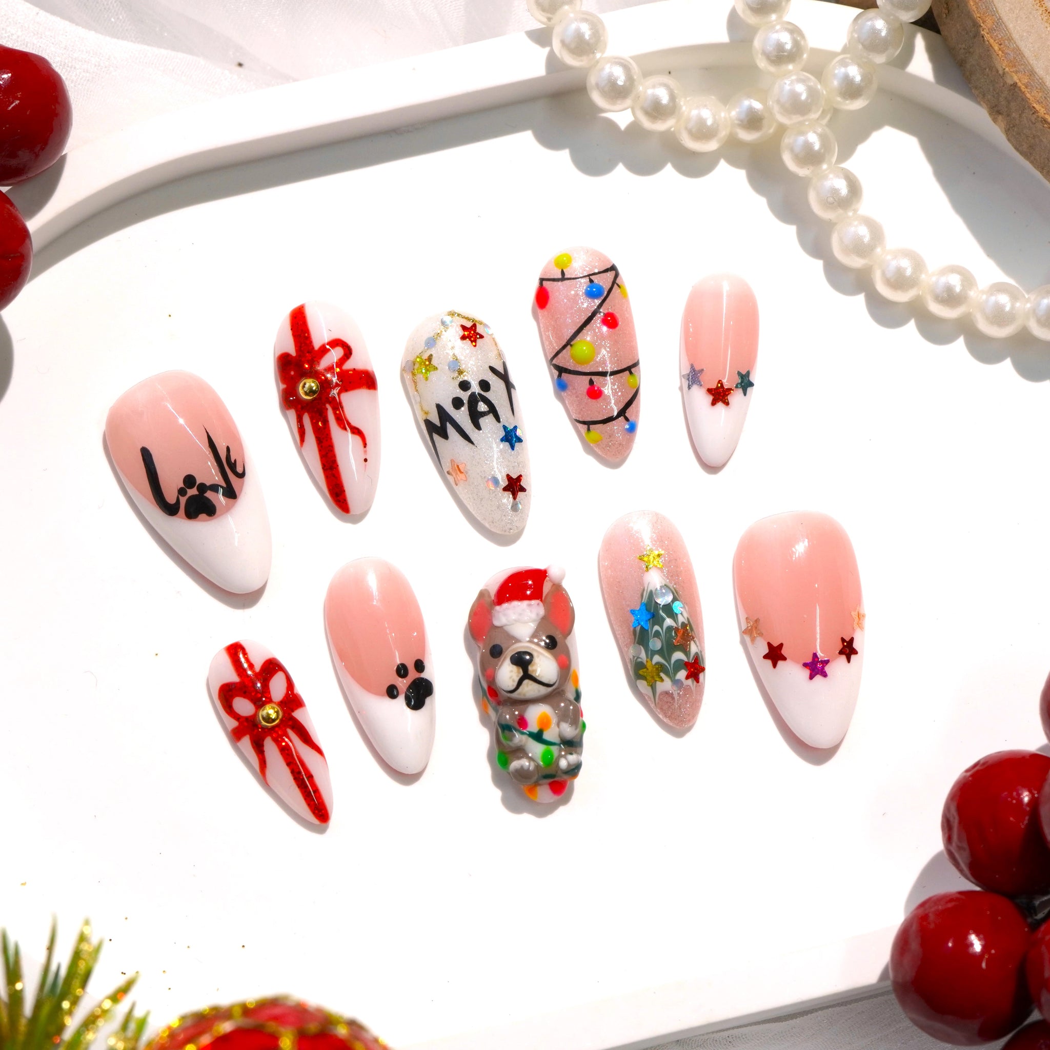 The nail set is inspired by the popular French BullDog breed, combined with familiar Christmas symbols such as Santa hats, snowflakes, Christmas trees, and red bows.