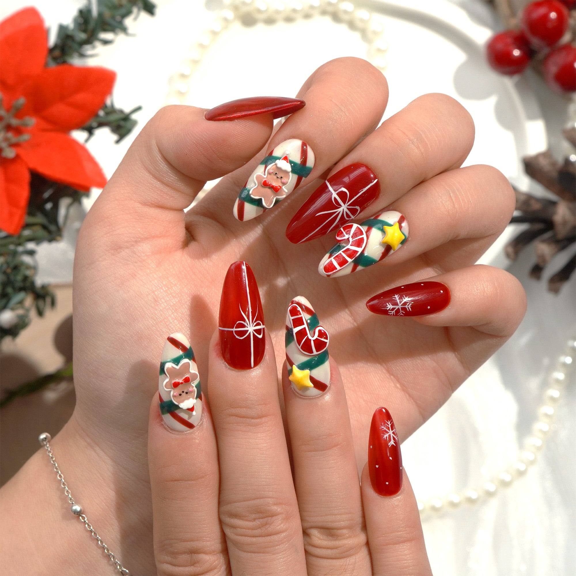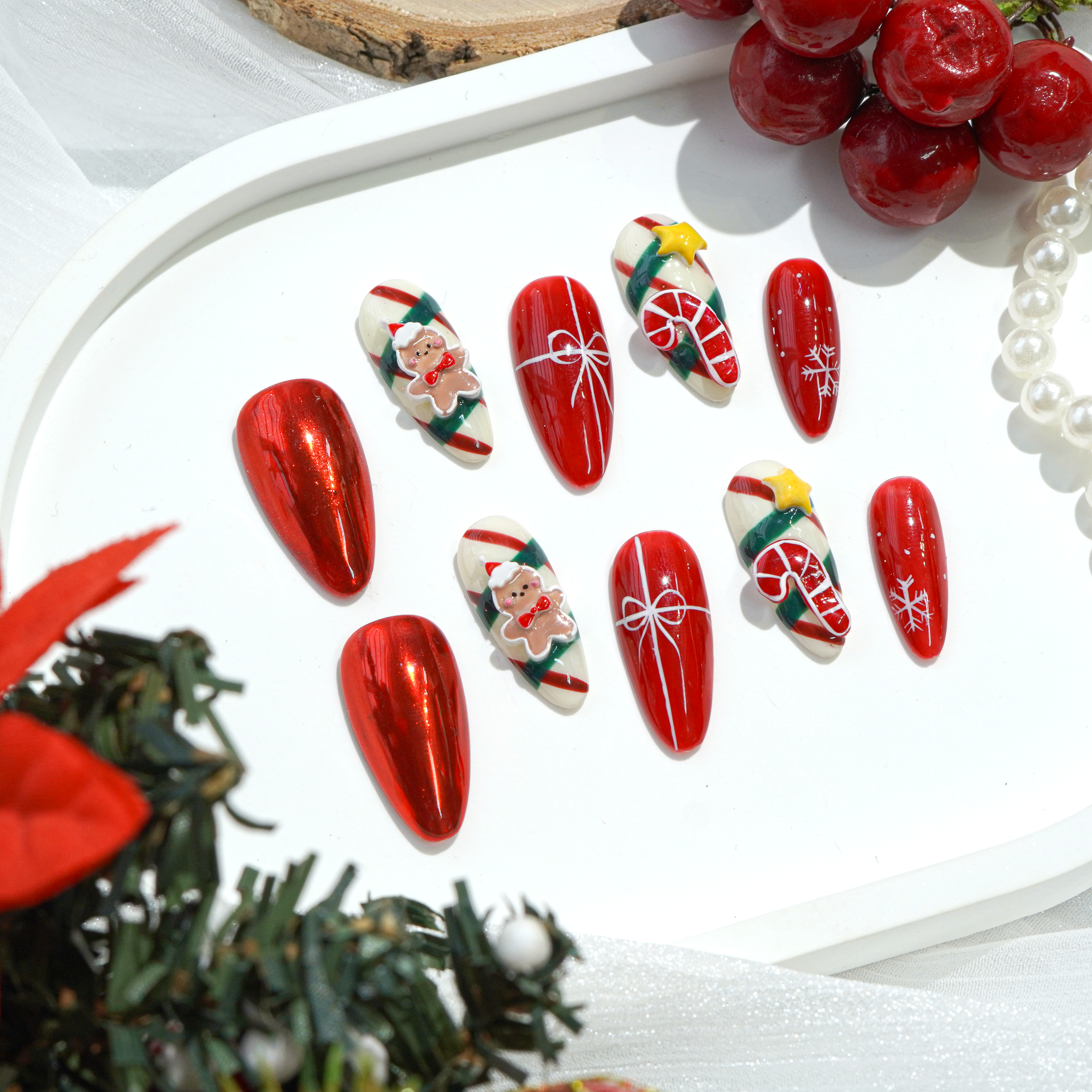 Bring the magic of winter and the joy of Christmas to your fingertips with Handora Nails' handcrafted press-on nail sets – perfect for adding festive flair to your holiday look. Each set is thoughtfully designed with cozy winter elements like snowflakes, shimmering accents, deep reds, and pine greens to capture the season's spirit in every detail.